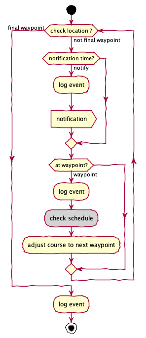 Actor extracts the route details. System creates a “schedule” file with the waypoints plus additional information like distance to next waypoint, bearing of next waypoint, and ETA. There are two variations on creating a schedule from a route.